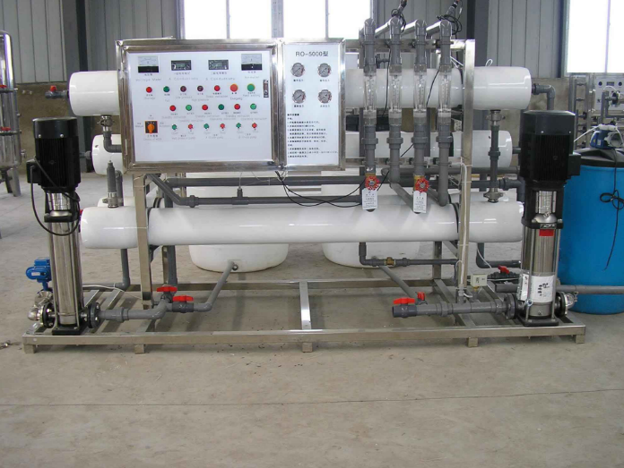原水处理系统:包括原水箱、预处理设备(如多介质过滤器、活性炭过滤器、软化器等)、反渗透(RO)系统或超滤(UF)系统等,用于去除原水中的悬浮物、有机物、重金属等杂质。